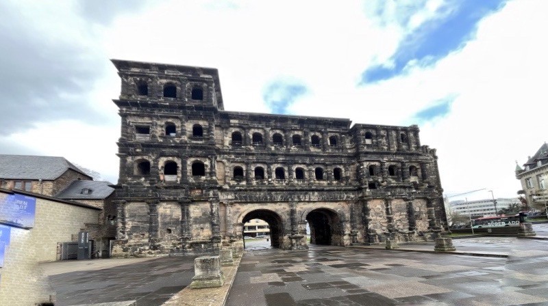 | Der Trier-Besucher landet zunächst immer an der »Porta Nigra«, dem schwarzen Tor, denn es liegt nahe den Parkplätzen am Rand der Stadt. Triers Baudenkmäler aus römischer Zeit sind seit 1986 UNESCO-Welterbe: das Amphitheater, die Barbarathermen, die Kaiserthermen, die Konstantinbasilika, die Porta Nigra und die Römerbrücke. Zum Welterbe gehören außerdem zwei mittelalterliche Bauten: der im Kern noch aus spätrömischer Zeit stammende, romanische Trierer Dom und die frühgotische Liebfrauenkirche. Darüber hinaus umfasst die Liste der Kulturdenkmäler in Trier Orte, Gebäude und Monumente aus nahezu allen Epochen von der Frühgeschichte bis zum 21. Jahrhundert. Der Bau des Stadttores als nördlicher Zugang zur Stadt Augusta Treverorum (Augustus-Stadt im Land der Treverer) begann 170 n. Chr. Die Datierung des Tores war lange umstritten und reichte vom 2. bis zum 4. Jahrhundert n. Chr.[2] Im Januar 2018 konnte der Baubeginn aufgrund einer dendrochronologischen Untersuchung von Holzresten der Stadtmauer auf das Jahr 170 n. Chr. festgeschrieben werden, da dieses Holz aus Bäumen stammte, die 169/170 gefällt worden waren. |