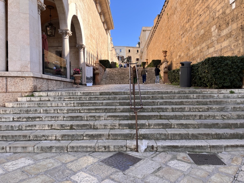| Wollen wir in die Kirche, müssen ganz links am Wasser vorbei die Stufen erklimmen. Vorbei am Palast kommen wir zu »La Seu«. Unten an der Treppe bekommen wir noch die Bronze-Statue »Femme« (Frau), 1970, von Joan Miró zu sehen (Bild Mitte. Ein Abguss steht auch in Baden Baden vor dem Burda-Museum). | ||||